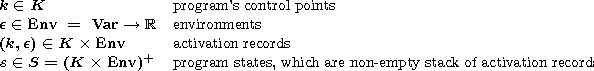An environment is defined by a function assigning a value to a set of variables Var visible in the current scope. A program state is a non-empty stack of activation records. A stack is viewed as a word where the last letter corresponds to the top of the stack.