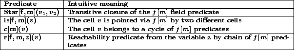 We detail below rather "standard" instrumentation predicates, common to most TVLA specifications. f[m] denotes any field predicate (binary core predicate representing the field of a record of pointer type), m a mode (either inp, out or ext), and z any local variable (unary core predicate).