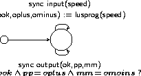 The disk controller works a follows. It receives the speed of the disk and emits appropriate signals plus and minus to maintain the motor speed within a specified range (here [8,12]). The controller include a property observer (node Property), which specifies the following property: whenever the speed has been outside the range for a given delay (here, 7), counted as a number of steps, a false ok signal is sent.