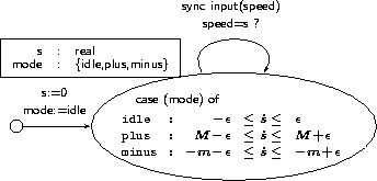 The device starts with a null speed. It can be in 3 modes: accelerating (stat=splus), decelerating (stat=sminus) and no action (stat=sidle). The derivative of the speed s lies between resp. [M-eps,M+eps], [-N-eps,-Neps] and [-eps,eps] in these modes. The process synchronize on channel cinput to semit the speed and on channel coutput to receive the plus or minus signals.