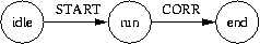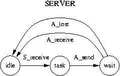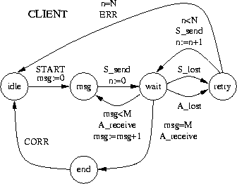 Let us describe a small example. We will model a client and a server which communicate through a two unreliable channels (a channel for each way). The client has to send a sequence of M different requests to the server. The server treat the request and send an acknowlegdement. If there is a failure (we suppose that the client can detect it), the client can retry twice to send the request. On completion, the sender emit the message CORR, otherwise the message ERR.