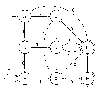 On commence par rendre cet automate initialement connecté. On supprime donc l'état H qui n'est pas accessible. On supprime du même coup les deux transitions de H vers E et de H vers G :